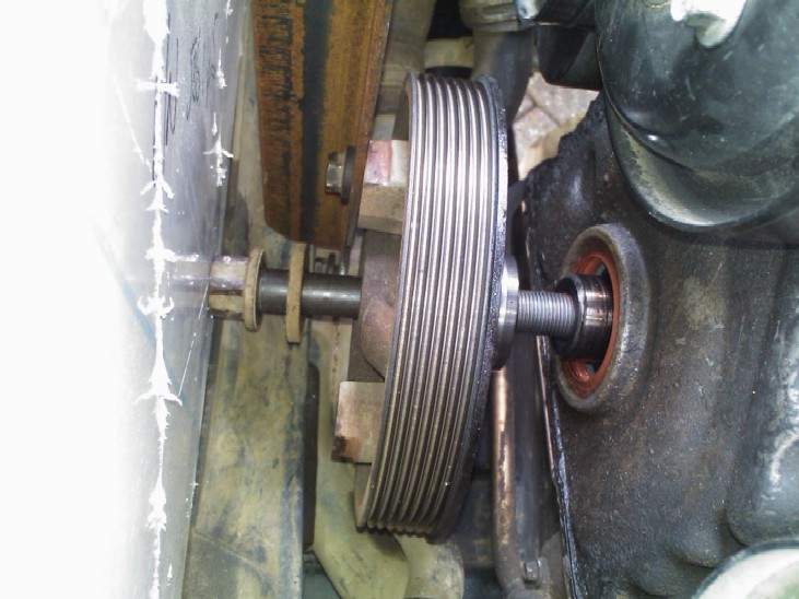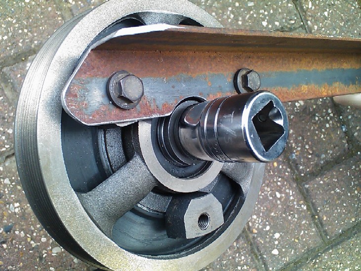 My tool to hold the pulley is simply 3 bits of ali flat bar, which pivot on 2 bolts and have holes drilled in the end to fit the pulley bolts. Once my tool is bolted in, I then remove the 3rd pulley bolt so it allows room for the spanner to fit onto the hub nut.
