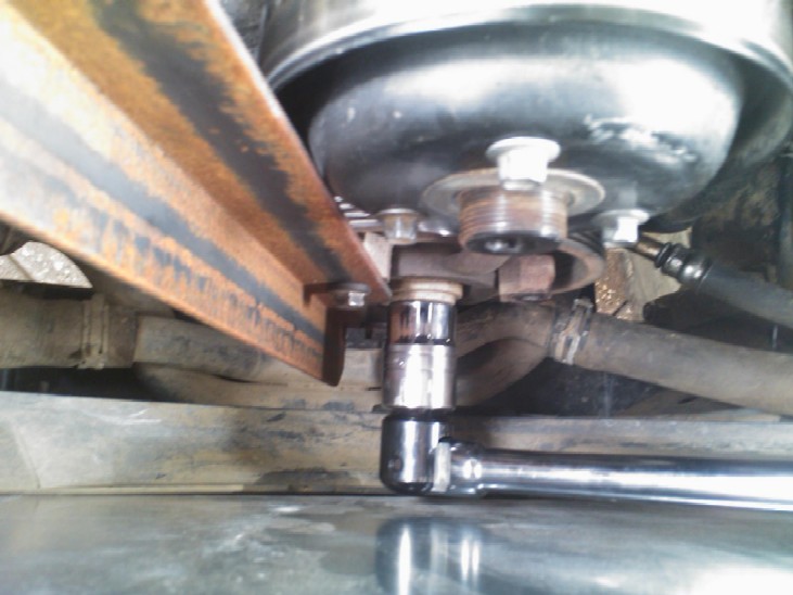 It's a tight squeeze to fit the bar and socket onto the bolt head, but it will go, a small tug forwards on the radiator will provide a little more room. *****NOTE the sheet of metal protecting the radiator*****