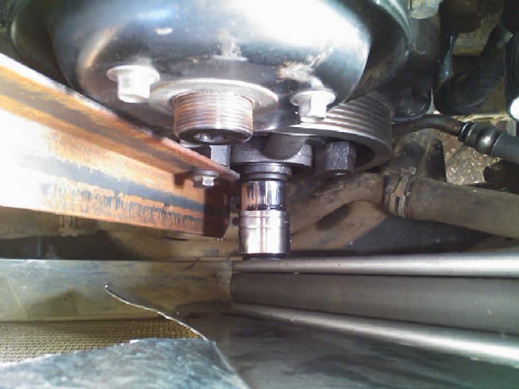 ****NOTE..... the genuine damper has an "offset" hole, the OEM ones don't, so when you come to make your tool and drill the holes in it, use your NEW damper as a template, even then it "may" not line up in one position on the original damper, not a real problem as you can rotate the crank to get it to line up with the other 2 holes.**** So, now its time to fit the tool to the engine, and position it so you can hold it whilst undoing the pulley bolt, this bit really is a 2 person job and you will have to heave against each other to crack the torque. You WILL need either a 24mm 3/4 drive socket, or a 15/16 3/4" drive socket to undo this bolt. You cannot use a 1/2" drive and step it up as it will make the length of the bar to long to fit between the radiator and the engine. The workshop manual states to remove the radiator, well it can be done with out disturbing the cooling system as in this article, but you must use the tools I specify to complete it. To avoid any possible damage to the radiator, get a piece if thin metal sheet to put in front of it so you don't damage the fins with your bar and socket as the space is VERY limited. I would suggest a sheet no more than 2-3mm thick as it really does make that much difference!!