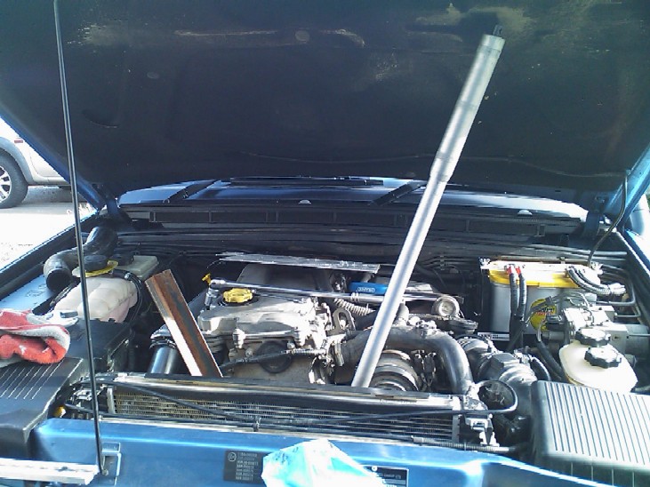 My original intention was to make the tool "over long", and then cut it to required length and when undoing the crank bolt, wedge it under each chassis rail, but once I had got it all apart, with the amount of pipes etc running across the front of the engine, its pretty difficult to get a good point to wedge it without the possibility of damaging something, so its fortunate I left it as long as I did. This means it gives a good leverage against the big bar (3/4 drive) you'll need to remove the crank pulley bolt. The tool has 2 holes drilled to line up with the pulley where the damper bolts on, and the "cut out" on the bar you see is to allow the socket and washer on the bolt to clear. Fits like below