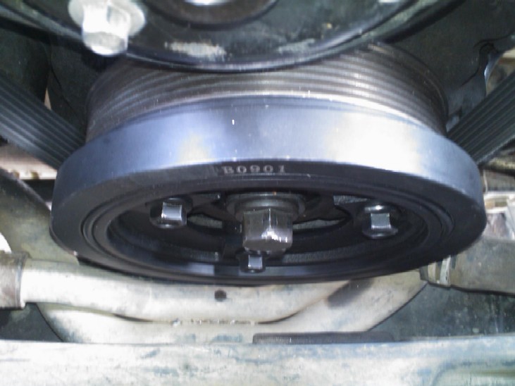 Next fit the new damper part back onto the new pulley, and torque the bolts to 59lbs ft.......again you will need to hold the crank from spinning whilst torquing them up....you can refit the V-belt either before or after the damper assy is fitted, up to you.