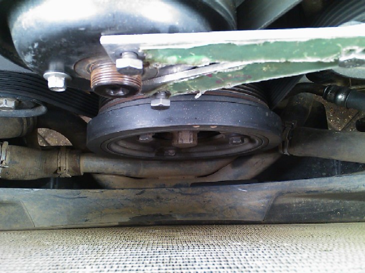 | As the mileage and "use" of the vehicle increases, more and more stuff begins to wear out!!! (landys don't we just love em!) and the crankshaft pulley to my surprise is another one of those items. On most cars I'm used to a pulley bolted to the end of the crankshaft, made entirely of metal and expected to last the life of the vehicle.Well the TD5 crankshaft pulley is a little more "complex" than that. The pulley itself is made from several parts which are bonded together with a strong rubber, and to the front of that, a TV damper is also bolted to it. Rubber I hear you say ? well I was surprised as well........and it seems mine had come to the end of its useful life.
