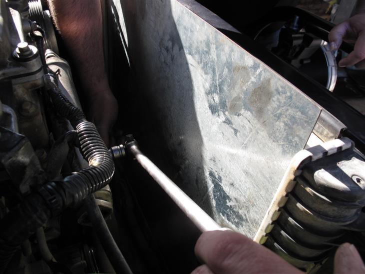 One spanner sits over the pulley bolts, the other fits the nut on the fan itself. These spanners are available on Ebay and a well worth buying, not only for just fan removal itself, but you will NEED one of these spanners also as a tool to do the actual bearing replacement. It is not 100% needed, but I also remove the fan shroud as well, this is held by the 2 screws on the top corners of the radiator, simply remove the screws and lift the fan shroud out of the way being VERY careful to move the plastic coolant pipes aside as you do it. Once the shroud is removed, then I STRONGLY advise that you fit something to protect the radiator..... this will ensure that should you slip etc with any tools you wont damage or even worse puncture the radiator...I use a 2mm metal sheet cut to size....