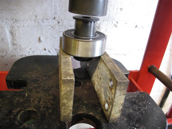 Now we have to remove the bearing from the shaft as it is pressed on, so unbolt and remove your fan tool and then using a press (recommended) or large vice, press the shaft out of the bearing..