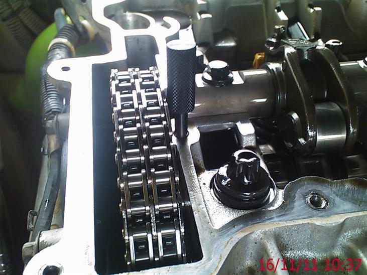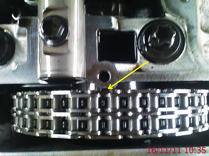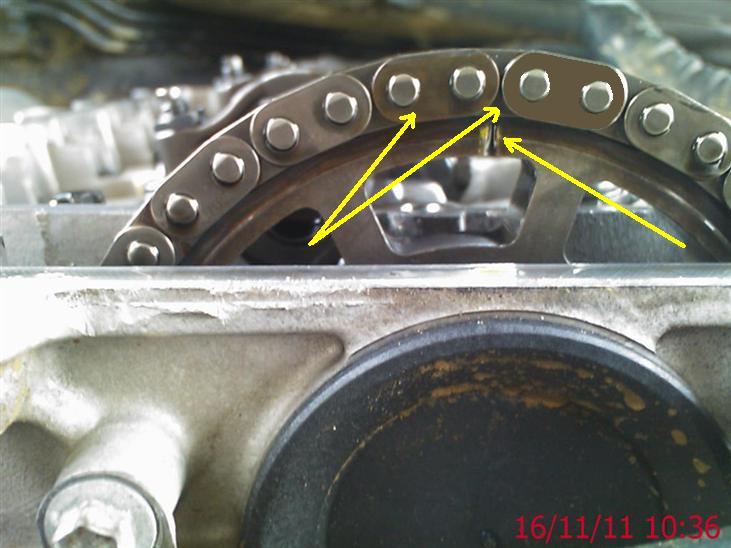To confirm 100%, you should now also see a "timing mark" on the front face of the pulley, it can be either a small slot cut into it, or stamped "dots".......this will also coincide with 2 different coloured links on the timing chain itself.