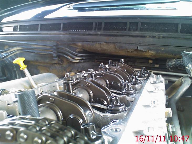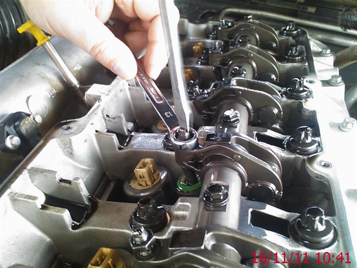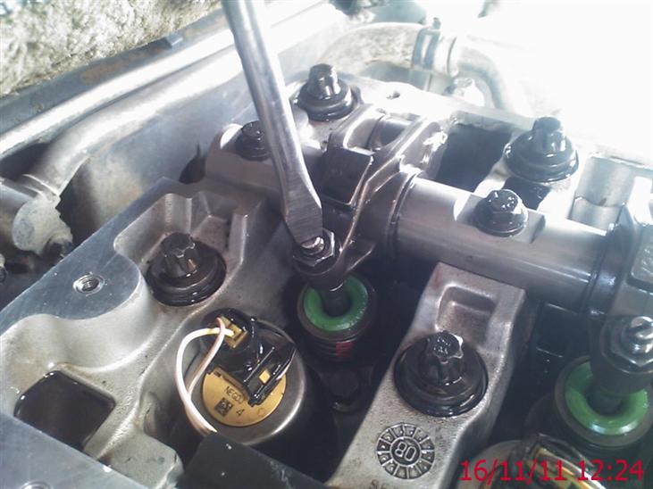 Both the timing mark on the camshaft sprocket and coloured links arrowed above. Now that the engine is locked into this position, we have to undo and loosen the lock nuts and rocker adjusting screws so that they are clear of the injectors to prevent damage on re-assembly.