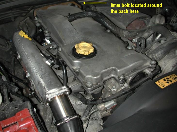 Now because of the rear acoustic engine cover, and the injector splash shields, its almost impossible to "feed" the rocker cover into place without knocking the seal of where it goes over the rear of the camshaft, so to help me get around this, at the back of the engine on the passenger side (uk car) there's is an 8mm bolt that holds the rear plastic engine cover to the block, remove that bolt and this will allow you to push the engine cover back towards the bulkhead and makes it far easier to get the rocker cover back into position without knocking the seal off each time. I wedged a hammer handle in between the cover and block to keep the cover pushed back against the bulkhead. below is a picture of the rough location of where the bolt is
