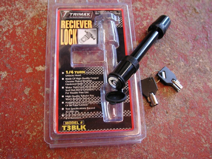I will have to purchase or modify my existing drop plate / tow ball to fit the receiver, and also purchase a few accessories to go in there to, and believe me there's a LOT around !! some of them are gimmicks, but others are very useful fittings to have. These will be added on here very soon when I have completed the fitment of them !!! :o) UPDATE 01/05/2008 As with anything removable on your car, you have to either screw it down, or fit some kind of lock to prevent anyone with "light" fingers taking a fancy to your stuff !!. The Tow hitch is pre-drilled with a standard Class 3 hole which is 5/8 in diameter. In this country it seems that you can either buy just standard steel 5/8 pins and clips to hold in your towing attachment, or you can get a locking type, but as usual its expensive over here. This led me again to search the U.S to see what was around there. One of the if not the biggest name in receiver locks is Trimax. So after finding someone who would ship me one from the states I ordered one and here is what it looks like