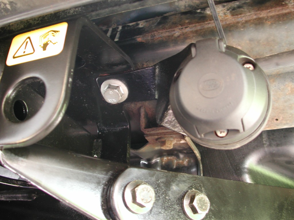 As you can see, there is a lot less "iron" hanging from the back, the departure angle for off road use is vastly improved, and the whole thing looks just a lot neater !! I'm not able to tell you what type of electrics the US use, I would suggest there is some difference to UK style plugs and sockets. As I already had a bar fitted and my electrics were already connected up it was just a case of fitting them somewhere near the new tow hitch. My existing electrics were mounted to a bracket that was bolted to one of the drop plate bolts, obviously not having that fitted and the fact that a new tow ball / drop plate would be removable means that it had to be re-located elsewhere. There is a bracket available in the parts catalogue for the US tow hitch, but I was sure I could get mine to fit. After some trial fitments, a large vice and hammer, I was able to re-shape my bracket and mount it to one of the tow hitch top bolts. This keeps it almost exactly in the same place as it was on the UK bar, and its nice and high up out the way of damage. The mounting bracket had seen better days, but after cutting the bolts out that hold the socket to the plate as they were so badly corroded and once I was happy with it's "new" shape I took it to my place of work. There I shot blasted it to remove the corrosion and re painted it black. Fitted some new bolts and nuts, Job done!!!