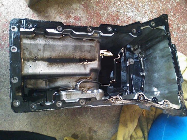 When it comes to the last bolt, remember the sump is cast aluminum so avoid dropping it at all costs, also remember either the 2 bolts or nuts holding the rotor filter drain tube, remove them and manouver the sump down and out to the rear of the car. The workshop manual states to also remove the exhaust front pipe, I chose to try it without disturbing that and it does actually come out easily with the front pipe still installed. Here's the sump below, as you can see there's ALWAYS some old oil you just cannot get out with a normal drain and refill !!