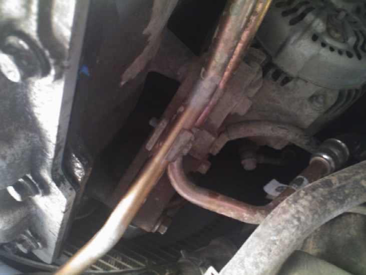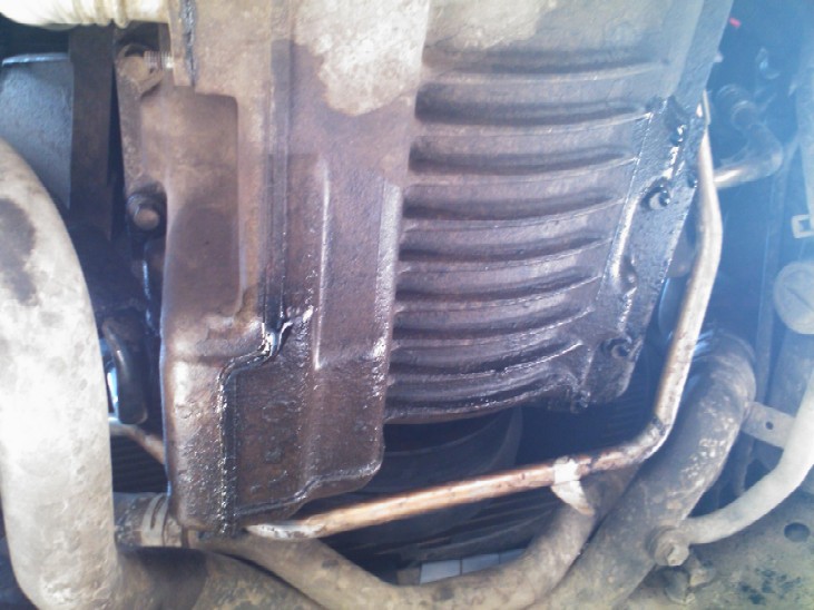 The gasket has molded "dowels" on it to make sure it locates correctly both on the sump and on the bottom of the cylinder block. The gasket is installed DRY. Now before the refit, You need to carefully clean the mating face of the cylinder block with some clean rag or tissue. While I was doing this I noticed what the next job would be :o( At the front left corner of the sump, the power steering pipe coming down from the reservoir passes the sump VERY closely on its way up to the pump, in fact its too bloody close as it has been chaffing away and was only a matter of time before it made a hole in the pipe. If you look at the picture below you will see the damage that has been done to the pipe!!
