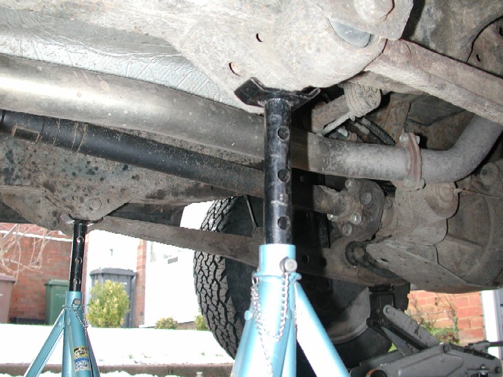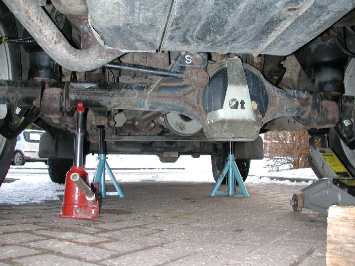 Then get 2 jacks, either trolley or bottle, I used my trolley jack and the vehicle bottle jack, lift and support the rear axle so the rear wheels are just of the floor, and then remove both rear wheels,