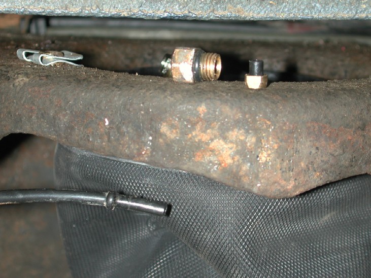 Next we have to somehow de-pressurize the Air springs, below you can see there is a 10mm connection union on top of each air spring, but because of where it is, its difficult to get a spanner in there to undo them, so its easier to let the air pressure out at the compressor end.