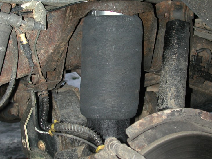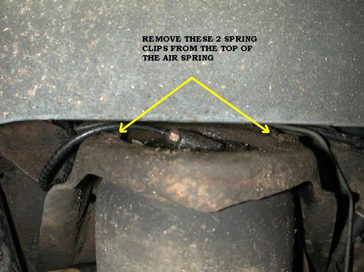 Once they are off, you can then partially collapse the air spring down from the top, this will make it easier to get a spanner on to undo the top air pipe connection, be careful not to "stretch" the air pipe whilst doing this as there is not a lot of slack in it. Once the pipe is off, collapse the air spring fully down so it clears the top seat. The bottom is simply hooked in place. If you look at your new springs, this will be easy to see. So rotate the whole thing from the bottom 90* and it will simply lift out.
