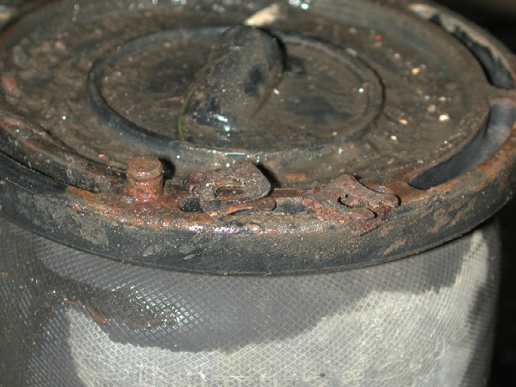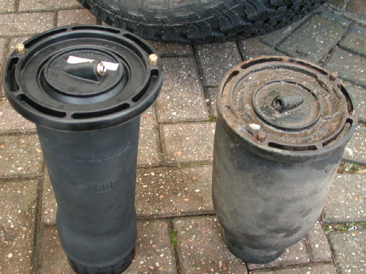 Here is a comparison of a new one to the old one. Now, depending on where you buy your new air springs from, will depend on how they connect back to the vehicle system. Land Rover charge TWICE as much for new air springs than any other spare parts retailers, Land Rover specialists and even Ebay is cheaper as well. My new springs have a "push" fit connector as opposed to the brass union "o" ring type found on the original springs. I'm not sure what type you would get even if you bought them from Land Rover, it maybe just a more modern way of connecting them up, who knows ?? My replacement springs were genuine Dunlop items, you can see the top connection difference in the picture below