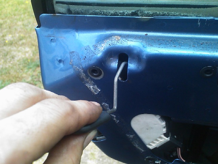Remove 2 completely and leave one finger tight to stop the motor dropping into the door. Now the fiddly bit, you have to disconnect the rod from the lock assy that connects it to the outer door handle, its VERY difficult to even get your hand in there let alone a camera, but I tried to show it below.....