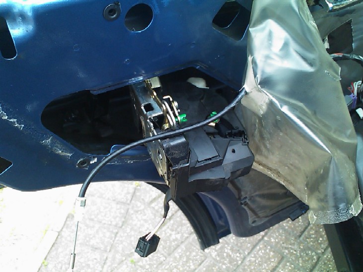 This now gives you enough room to squeeze the lock assy past the frame and out of the hole in the door...(picture shows interior handle cable disconnected)