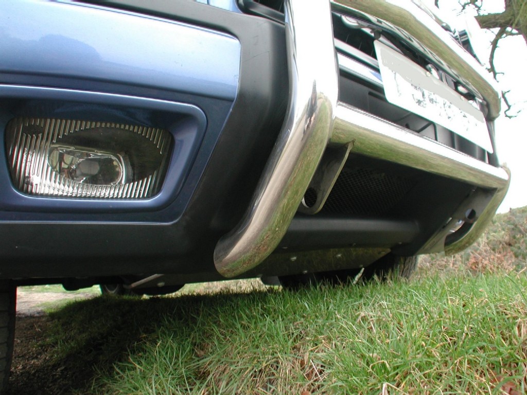 | The "A" bar or Nudge bar on my Disco was fortunately already there when I purchased the car, come to think of it, it probably helped a lot in the decision to buy it as I like 4x4's with them fitted, what ever make they are. There is as we all know lots of public opinion about them, and new changes to the law now make it illegal to fit one of metal construction like what is fitted to my disco. If your car has already got one, don't panic you don't have to remove it. If you buy one second hand to fit to your vehicle, I'm unsure how the law affects that, so I would advise you do some of your own research into the new rules, google is always a good start !! The basic idea of the the A bar or Nudge bar is to help protect the front of the vehicle when off road, the traditional "bull" bar has its own reason for being there as the name suggests. If mine never had one fitted, then I definitely would have looked for one to fit, what type / colour ,metal or plastic, who knows but one would have gone on asap. They also provide useful mounting points front Driving or spot lamps. Mine happens to be a "genuine" Land Rover A bar, and is available (or was) in stainless steel like mine or in black, both have the same shape and its just personal choice which you prefer. It simply fits through 2 slots cut in the bumper and mounts onto 2 brackets that are supplied with the A bar, these brackets fit over the front "crash cans" on the end of the chassis rails, and then the A bar bolts to those. The brackets that are used to mount it replace the existing front towing eye bracket, hence the A bar now also includes 2 front recovery points, useful for break downs or even when off road. I recently took my truck to a local off road site and had a day in the mud, during the day I was there, the A bar Definitely provided the protection its designed for to the front bumper / valance, the evidence is clear by the marks now on the A bar, that if it was not there I may have had a large bill to pay for repairs/ damage to the front end. Below is just a couple of pictures to show "the look", you can also see the spot lights I have mounted to the A bar to.