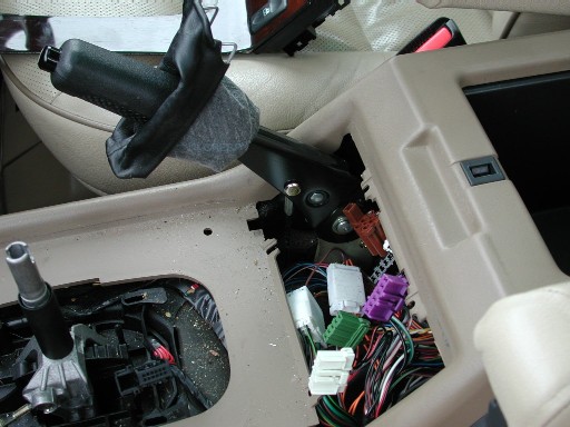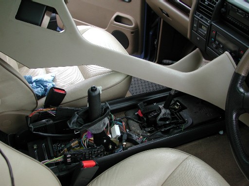 The Auto box mode switch needs to be unplugged now, this is a lever type plug, as you move the lever the plug disconnects automatically. Once the gaiters are free, simply unscrew the Transfer lever nob and gaiter, the auto box nob is just a push fit. Make sure the car is selected to "D" and then using a firm force pull the nob straight up and of the lever being careful not to smack yourself in the head !! STEP 3 Now carefully prize out the handbrake gaiter from the console, its easier to remove the top first.