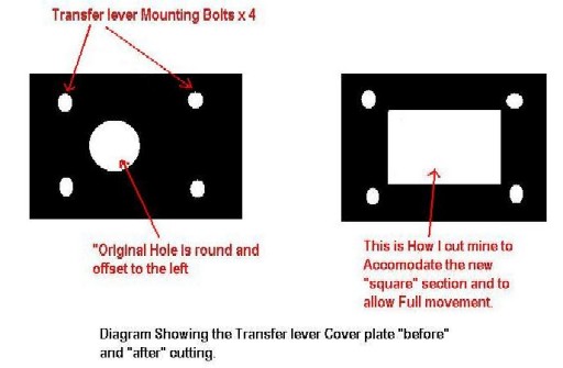 STEP 14 Before you can fit the new lever, you have to "cut" the transfer cover plate to be able to fit the lever in position and so it can move to select diff lock etc Here's a "rough" diagram to show you how big the hole will have to be to accommodate the new lever and its movement left and right as well as fwd and back for "high / Low" gears