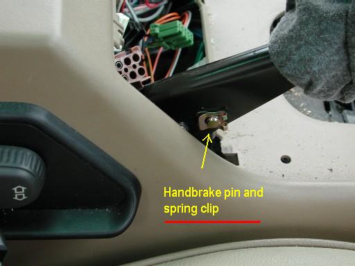STEP 4 NOTE!!!!! Now you will be disconnecting the handbrake cable, and because you WILL move the gearlever many times out of your way during the install, ensure the car is parked on flat and level ground or CHOCK it !! The handbrake cable is help by a pin and spring clip