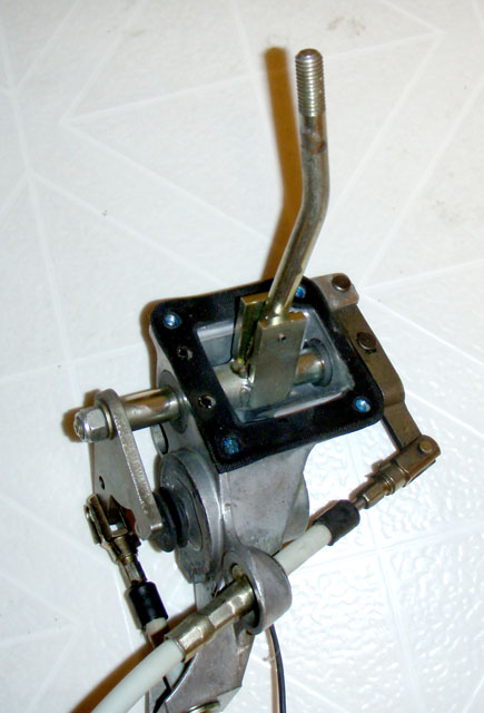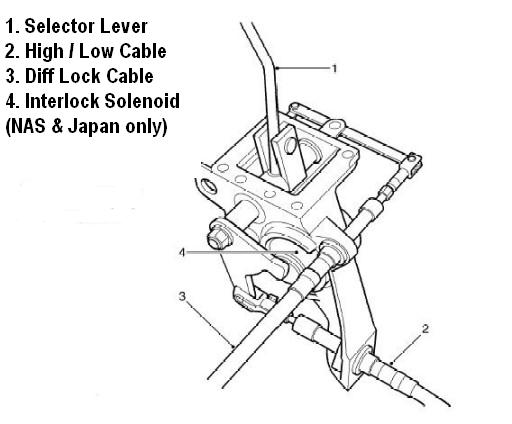 STEP 15 Here you can see the new diff lock lever, it has an additional linkage for the diff lock cable as well as the original hi-low cable. It is also "cranked" over to the right, and it sits in the centre only when the diff lock is actually engaged. It mounts using the same 4 bolts removed earlier in STEP 11