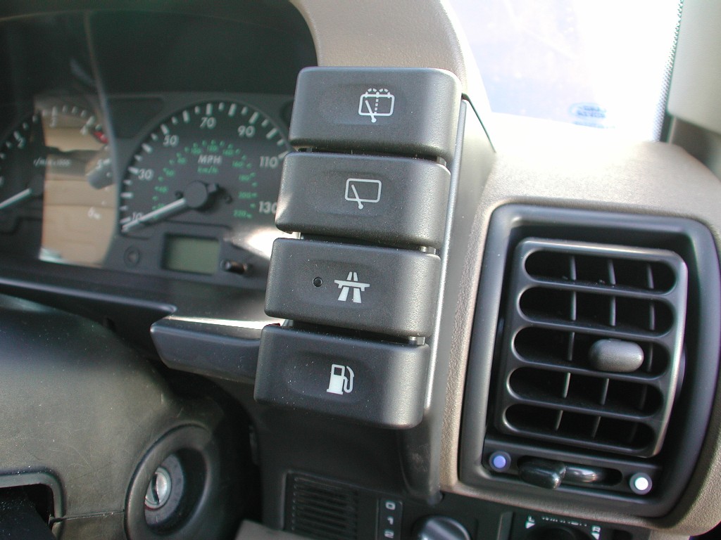| This is one of the "small" mods I have added after seeing interior pictures of "facelift" Discovery's. Below is the dash layout of a pre facelift Disco 2, you can see the fuel flap release switch is in the middle of the switch pack on the right hand side. Now this works well, as designed, but because I was used to cars that did not have a release as they were just unlocked with the central locking, I quite often found I had already got out at petrol stations and forgot to press it, so you had to lean right in to press the switch, maybe its lazy I don't know, but I just thought it was to far away if you forgot..... Land Rover must agree with me as from 2003 they fitted the switch on the right hand side of the Instrument cluster which makes it easy to reach if you get out and forget. So after noticing this in pictures I had seen, I ordered a switch from the local dealer, and then simply spliced into the existing circuit behind the original switch, run the wires up to the new switch position, and connected to the switch using very small blade crimps, now if I forget its at easy reach just inside the door, or if anyone else is in the car, I can shout to them and they can reach the original one as well. It also fills a blank that was there in the dash switch pack.