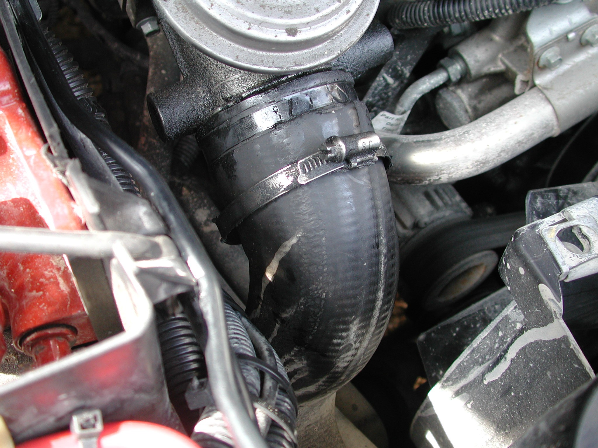 In the picture above is what you should have now, Grille, lower headlight trims and indicators out. You may notice that my fan shroud etc is still fitted, that is just because I took the photo's in a different order, Also the top headlight "clip in" covers and battery cover are also removed. Now you have gained access, its time to start getting at the intercooler. It has 2 hoses connected to it, the top one goes to the EGR valve on the driver side, the other on the passenger side comes from the turbo. Each hose has 2 large jubilee clips pictured below