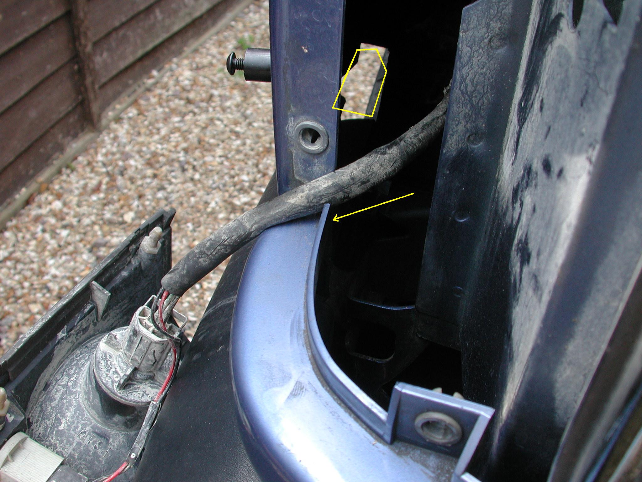 Once the top screw is removed, you need to firmly but carefully "pull" the indicator forward out of its plastic lugs, then just let it hang to the side on the wiring, you can if you wish disconnect the plugs completely to move it out of the way totally. Below you will see with the indicator "hanging" out, Also the arrow pointing to the next bit which is removing the lower headlight trims. They are screwed in from under the wheel arch, but you can see the area I marked in yellow, you can access the screw with a long Phillips screwdriver from under the wheel arch through the gap shown