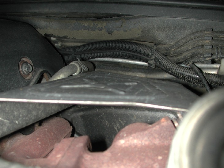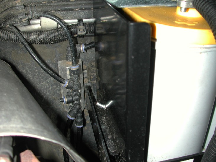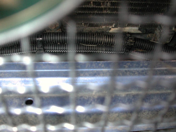 Its all tie wrapped to the pipe work which keeps it neat and tidy and out of harms way.....Next was the negative supply. Its regarded as far better to connect the 2 battery negative terminals DIRECTLY together and not to use the vehicle chassis as the ground return, this also applies to the winch which performs better when its directly earthed back to the supply battery. Now because there is already 2 large cables going round the bulkhead to the new battery, there really would not be enough room to get anymore cables that way, and it would make the cable run even longer than it needs to be, so the winch motor earth and the connection from the starter battery negative terminal were run again fully in conduit in front of the air con radiator tie wrapped to the pipe work and existing looms.......