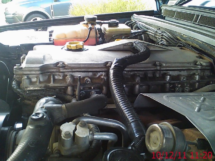 | There comes a time when things just give up, mechanical things simply do wear out and the water pump is just another one of them. The water pump can fail in a few ways, the seal between the cover and pump can leak, as can between the pump and the accessory drive casting.......also though the internal bearing of the pump itself can also fail. Now because of where the pump is fitted, if the bearing fails the water has to be allowed to escape, this is performed by a weep hole / drilling in the accessory casting that allows the water to escape externally instead of "building" up behind the steering pump. The water pump is actually driven by a keyed "wheel" which engages onto the rear of the Power steering pump which is in turn driven by the auxiliary belt. Replacing the pump is a fiddly task with not a lot of access available, so some "ideal" tools are needed to complete it as in this write up. You can off course remove more items if you so wish to give you more access, but this is how I do it below..... First of remove the engine acoustic cover...