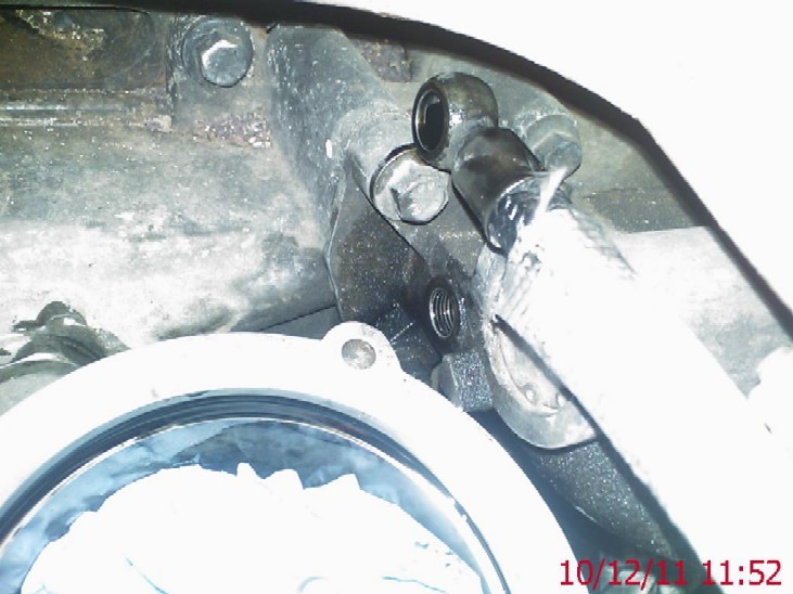 Turbo oil feed hose banjo removed (above), one washer stuck under the head still and the other from the housing side.. Once removed, then flex the hose up and clear of the rotor housing..