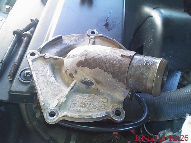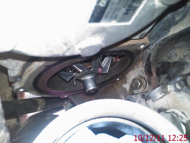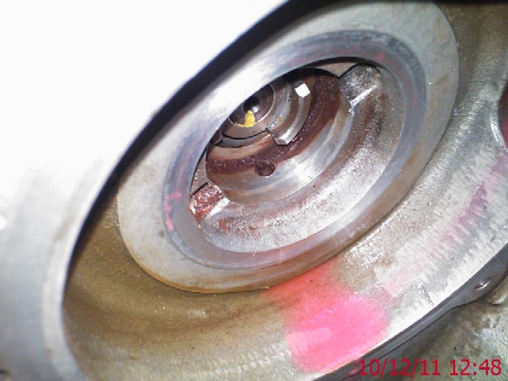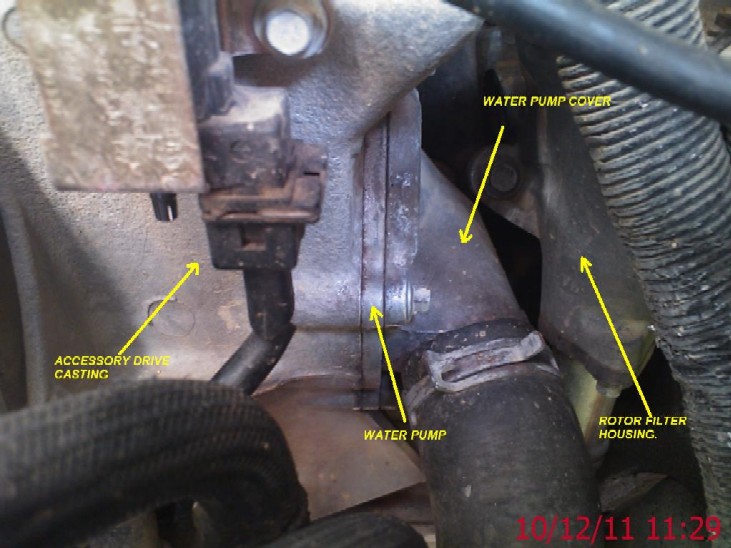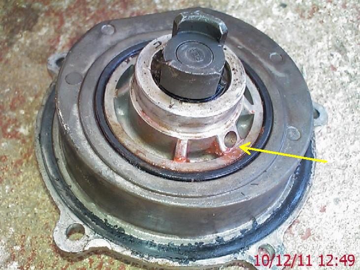 Old pump above, the "weep" hole in the pump shows evidence of coolant leakage...the holes line up with the holes / drillings in the accessory casting seen in the picture below...