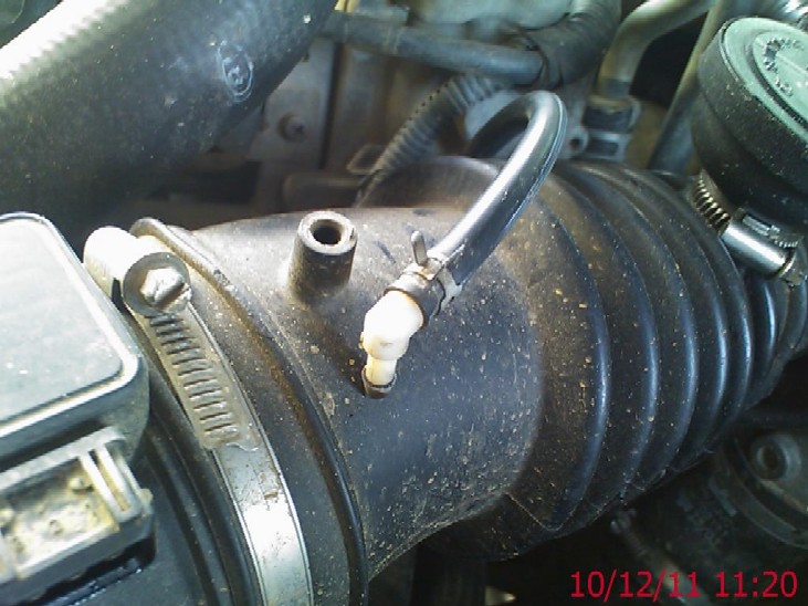 And finally the small tube that runs to the waste gate actuator controller. You can disconnect that at either the intercooler tube or off the bottom of the modulator, your choice.........vehicles without ACE have a little more room to work in.