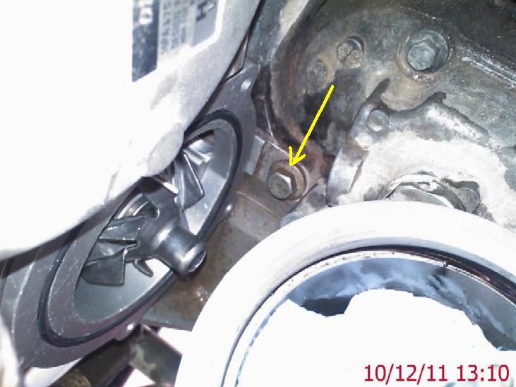The seals are "bonded" to the new pump, I have seen "Pattern" parts where the seals have already started to come away from the pump assy, so it would pay you to buy a good quality OEM or even Genuine pump. I used a Quinton Hazel pump which is the same as Land Rover used. When fitting the new pump, again manipulate it gently into the housing (hope you remembered how you go it out!! ), the pump has a unique shape so make sure its orientated correctly for the 5 bolt holes to line up......You must also make sure the drive key on the pump lines up correctly with the one on the back of the power steering pump, the water pump will not sit correctly if the drive keys are not aligned, you will also be able to rotate the pump impeller as well to aid your fitting, take your time it can be fiddly!!.. NOTE :- the new pump will not push directly straight back into the casting as the edge of the pump body will catch on the bolt arrowed below...