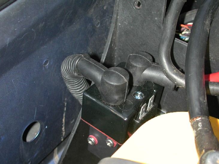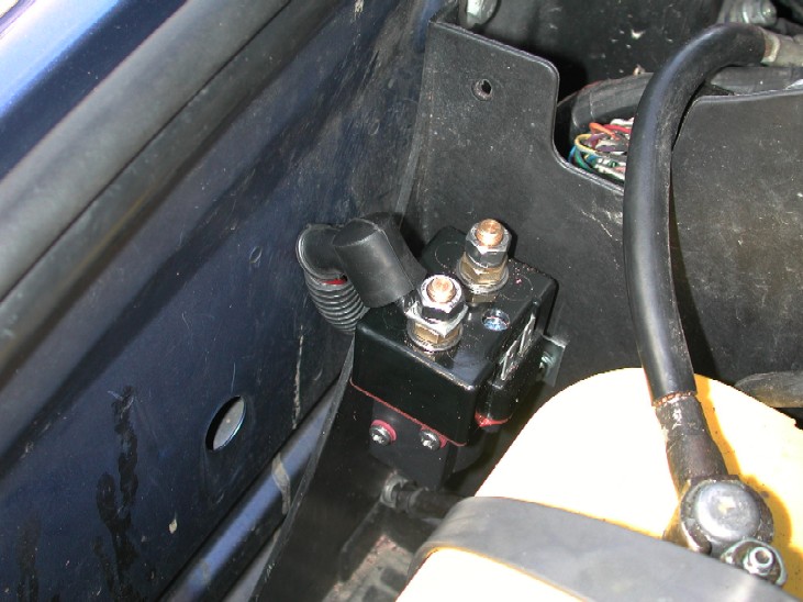 | My winch has been installed for a few months, and at the time of installation I did not install any means of completely isolating the power supply to the winch. It was not a major problem, how ever if anyone picked up the wireless remote and pushed the buttons, the winch would work at all times. Ideally you should have some way of isolating the power to the winch so in the event of any problems it can be shut off. There is many ways to do it, one off course is to install a key operated manual battery isolation switch in the winch power line. I did consider this way of doing it, but could not find a battery switch that specified it could handle the potential current draw of the winch. Another way to do it is to use a single winch solenoid and control that with a smaller switch to isolate the supply. There is a "Genuine" land rover kit available to do this job, but I went for what I consider a "better" product. I bought a "single" Albright solenoid to use as my isolator. Below you can see I bolted it to the battery tray / box as there is more room here due to the Optima Battery not being as large in physical size as the standard battery   So, it was just a case of me cutting the winch power lead I had installed before, adding 2 more terminals to connect to the Albright solenoid. I then fitted some more water proof rubber boots to the leads.